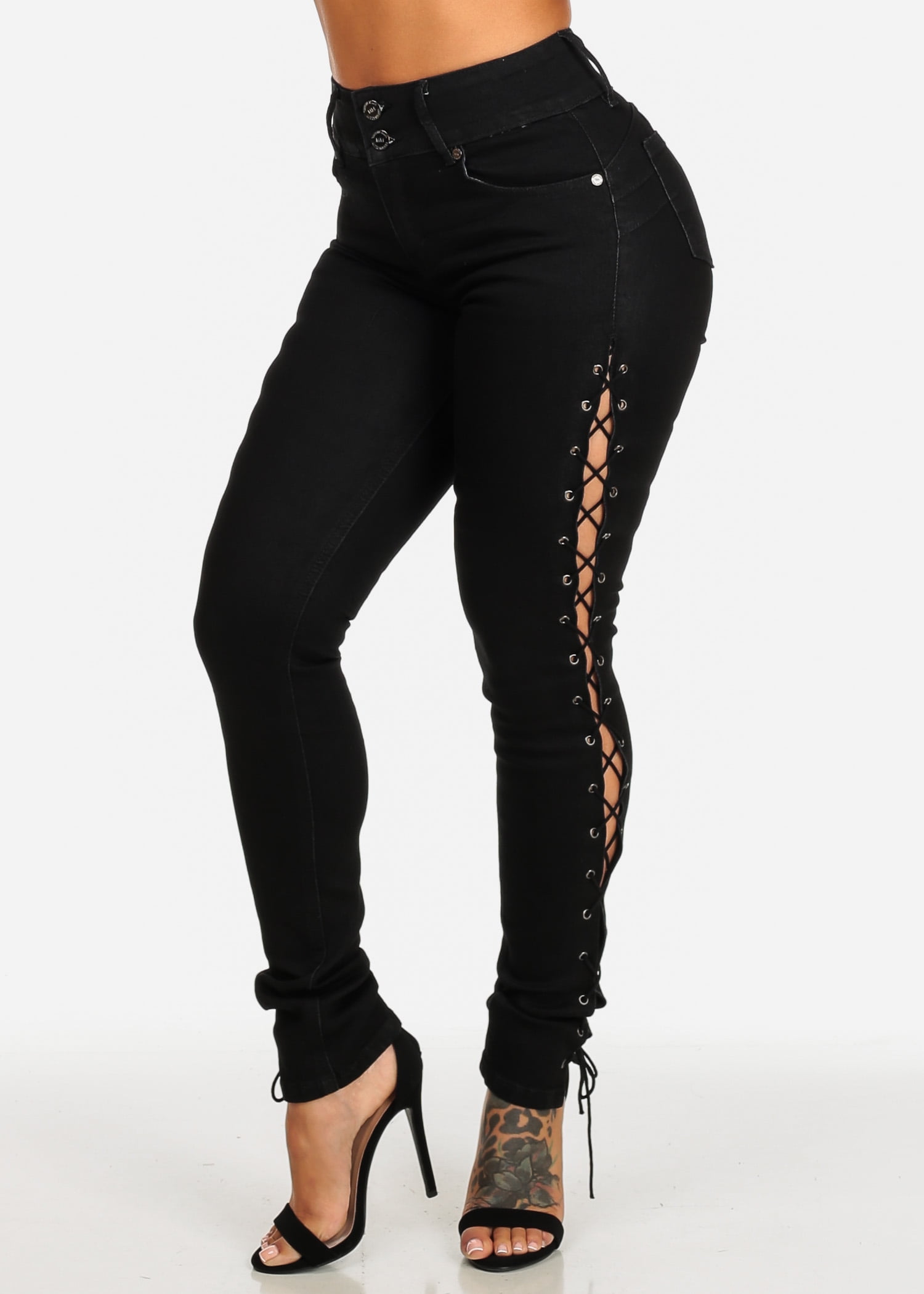 Womens Juniors Black High Waisted Push black jeans lace up side