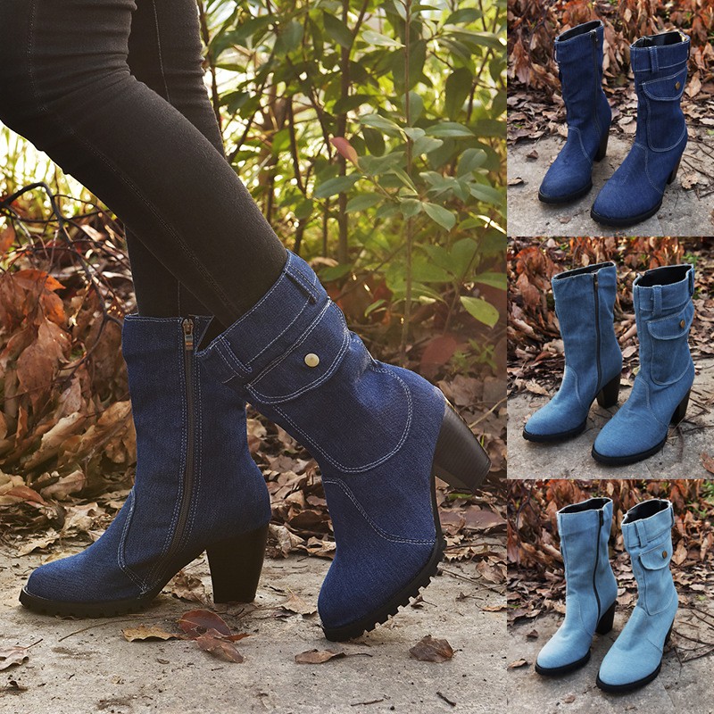 Women's Fashion Mid Calf Jean Boot jeans boots for ladies