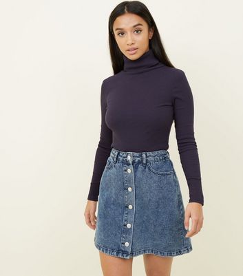 Petite Blue Acid Wash Button Front petite long denim skirts