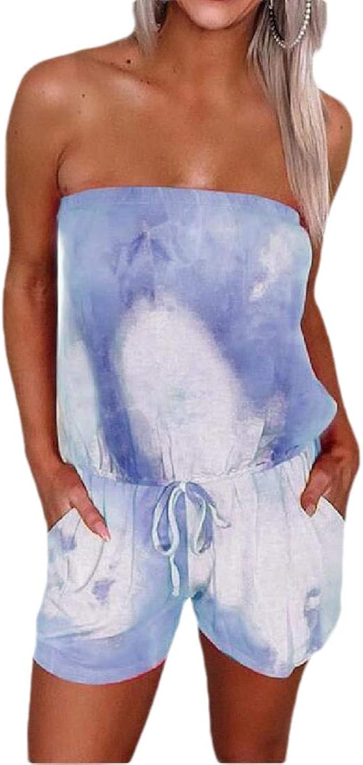 Jotebriyo Women Off Shoulder Tie Dye shoulder tie overall shorts