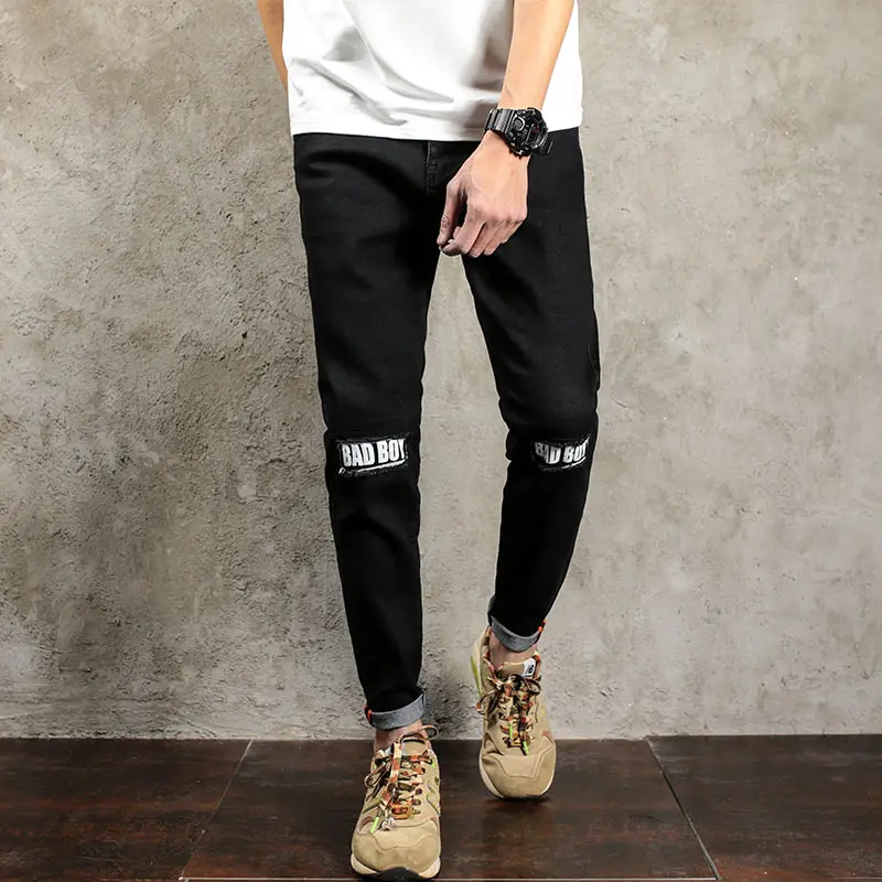 Black Jeans Men Pants Ripped Knee Patch black jeans with patches mens