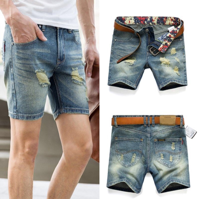Men's Three Quarter Jeans Hole Retro mens three quarter denim shorts
