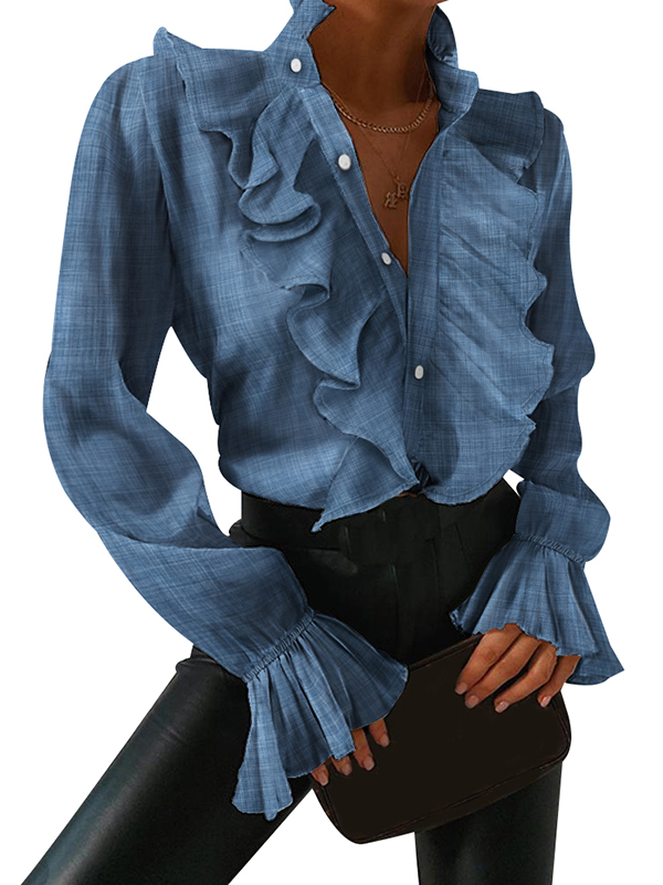 Ruffled Trim Button Up Long Sleeves denim ruffle blouse