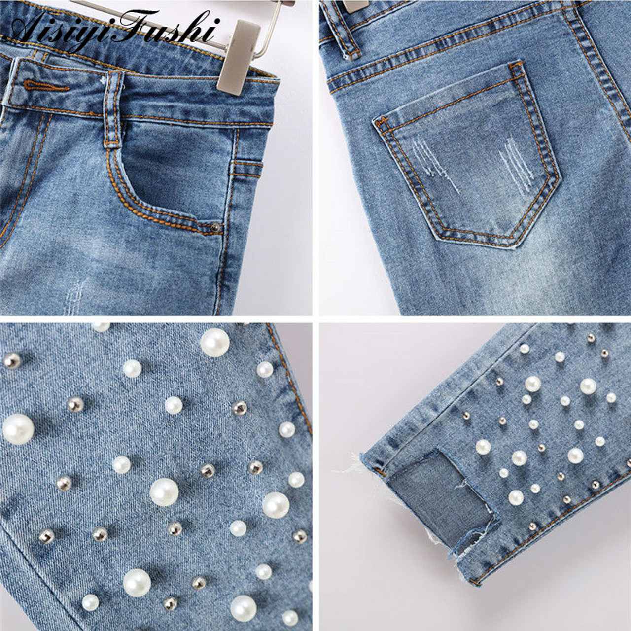 Ripped Capris Jeans Jeggings Skinny pearls with jeans