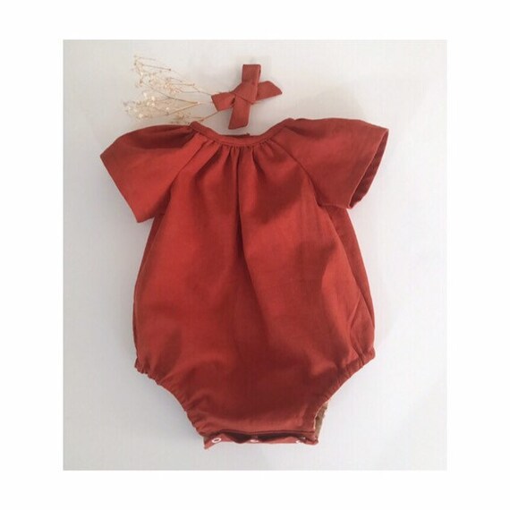 Gender neutral baby romper. Linen baby orange baby romper