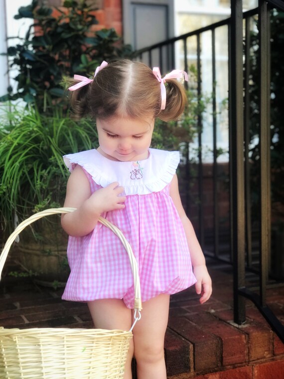 Bunny Embroidered Bubble Romper in pink pink gingham romper