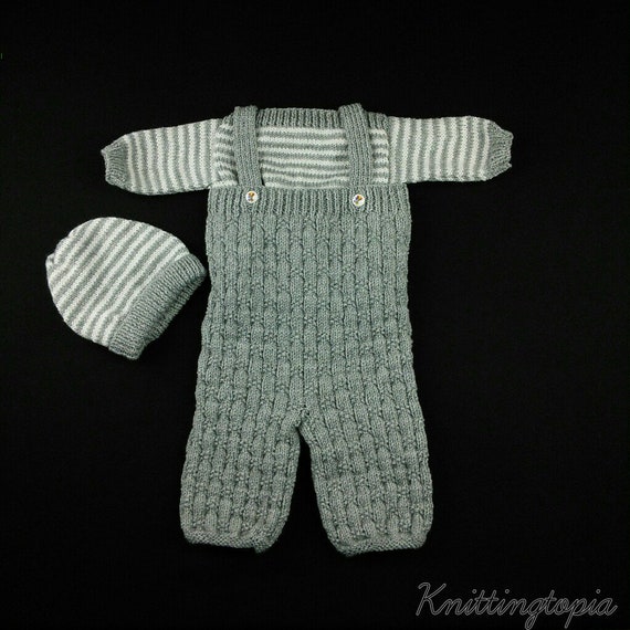 Hand knitted baby grey and white jumper knitted dungarees baby girl