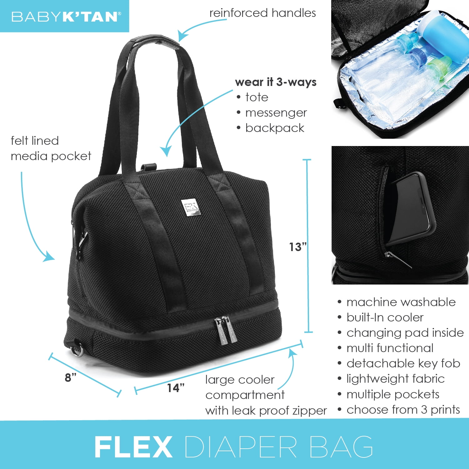 Baby K'tan Diaper Bag FLEX in Mesh black and tan changing bag