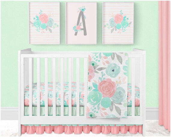 Floral Crib Bedding Cover Girls Nursery pink and mint crib bedding